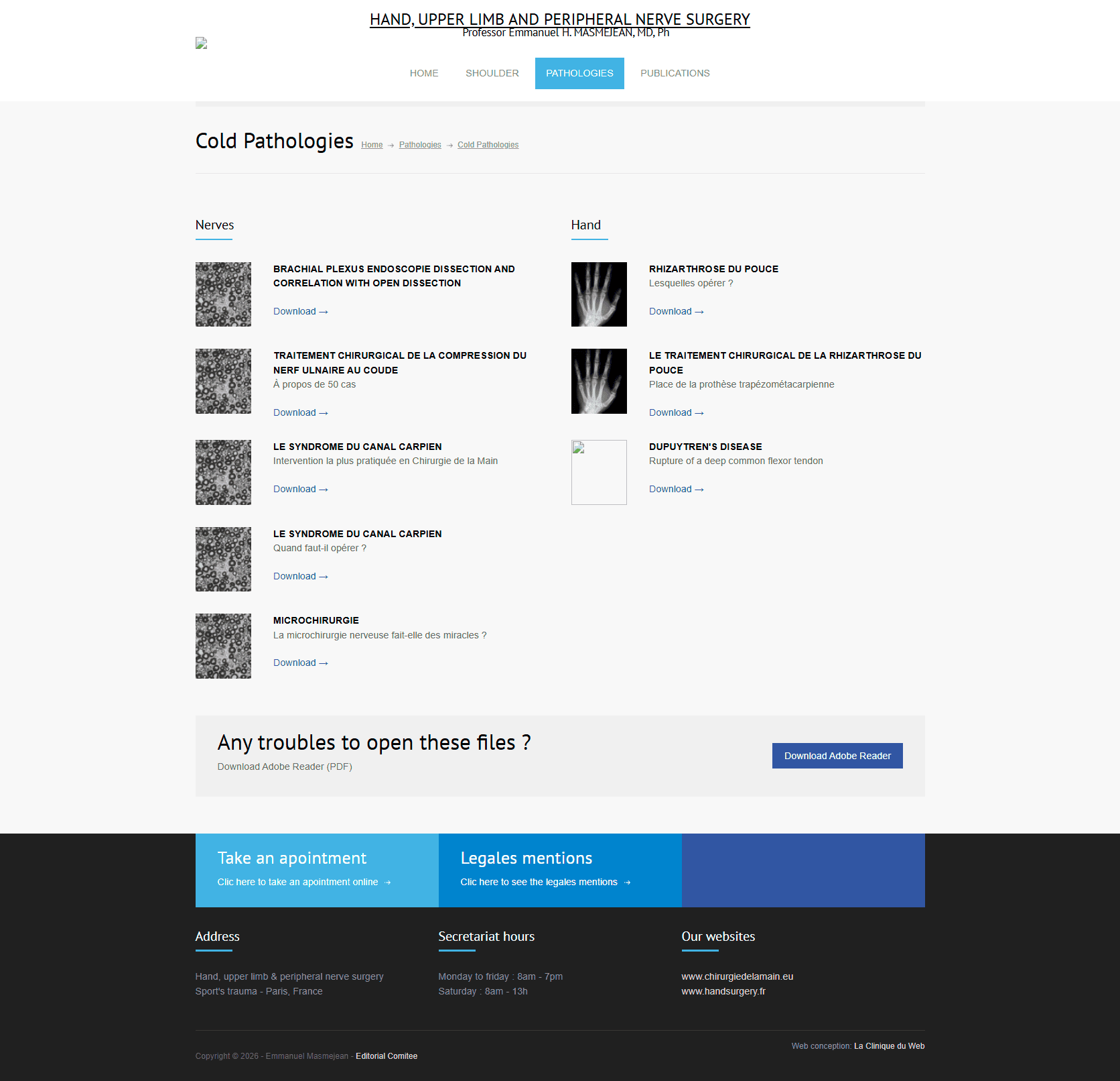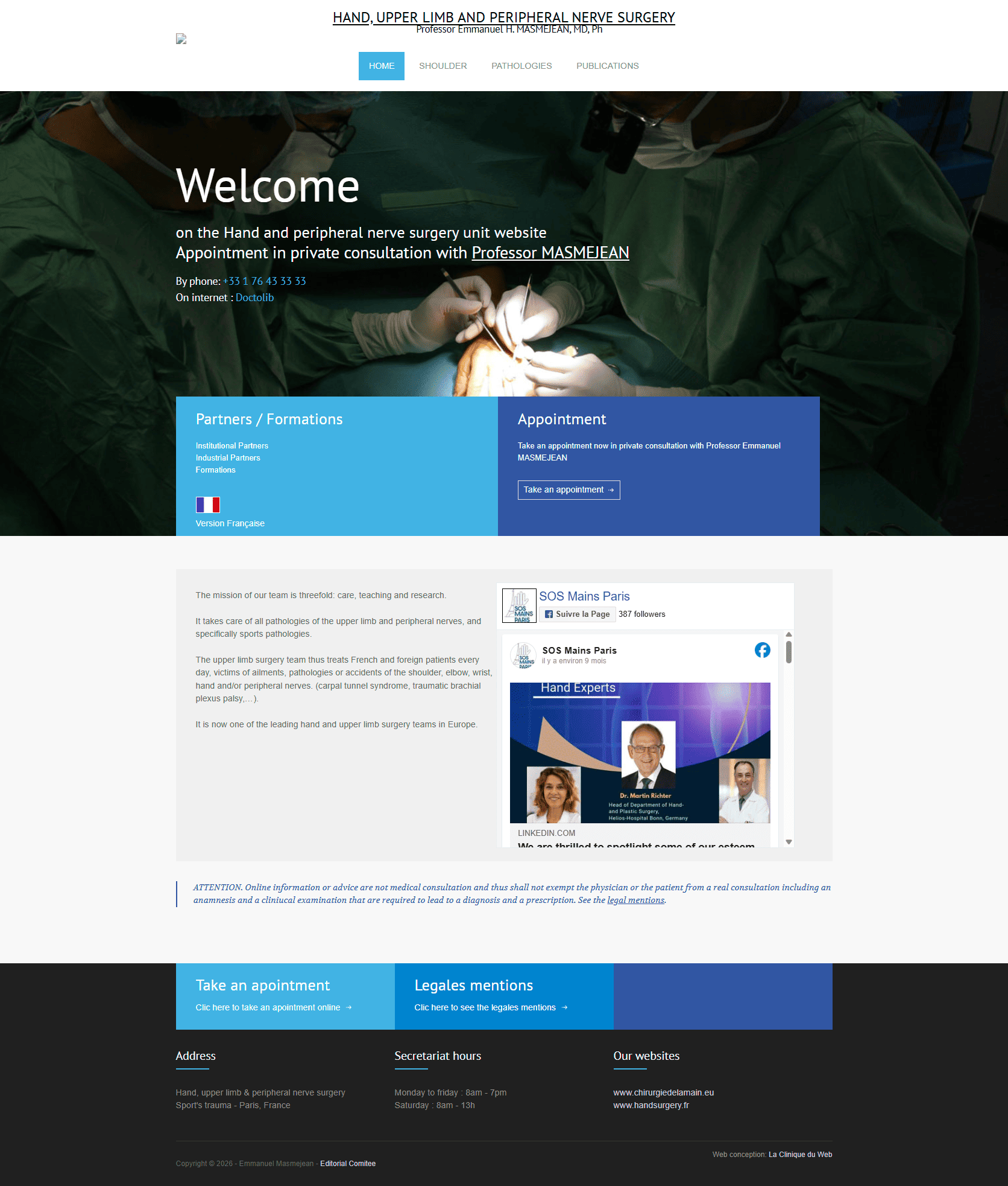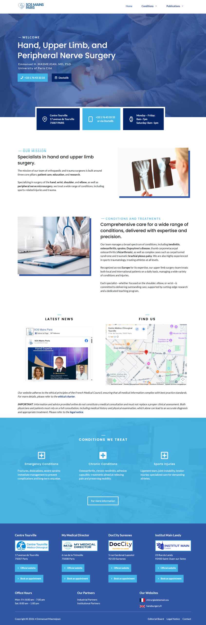 Un site médical de référence, figé dans le web d’une autre époque. Le Professeur Emmanuel Masmejean est l’une des figures les plus reconnues de la chirurgie de la main en Europe. Son site, lui, ne racontait pas vraiment cette histoire – jusqu’en janvier 2025 où il me confie la refonte de sa présence en ligne.