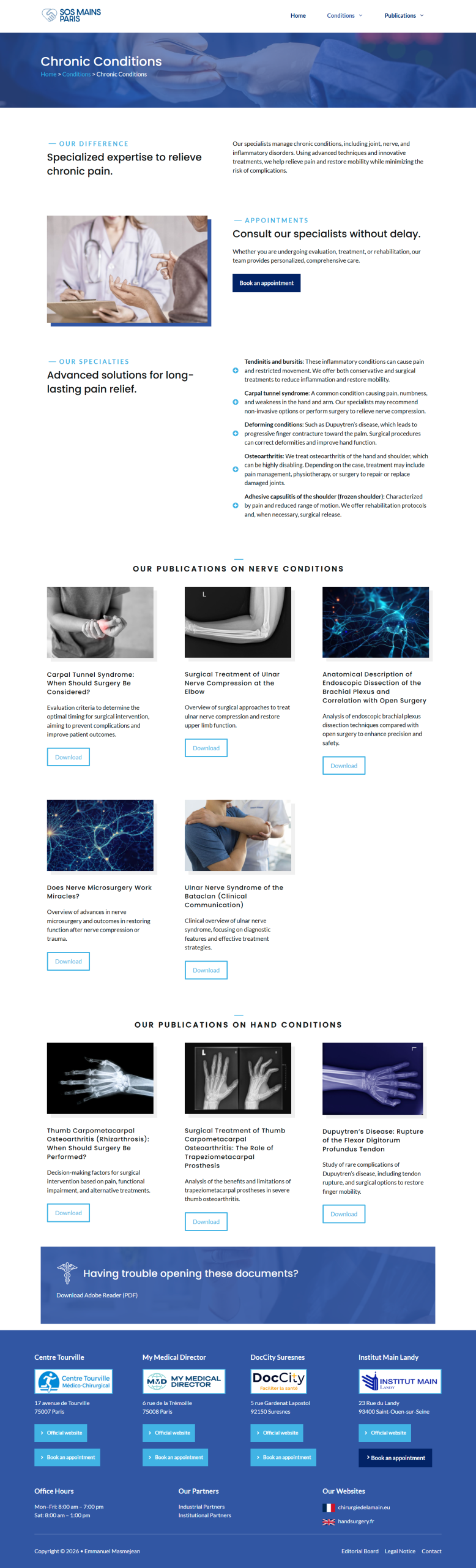 Le site ne disait presque rien. Pas de pages pathologies développées, pas de présentation de l’équipe, pas de contexte autour des publications. Or le Pr Masmejean a une matière éditoriale extraordinaire – des années de pratique, des publications scientifiques, des livres de référence. Il fallait construire du contenu à partir de rien, tout en restant dans le cadre déontologique.